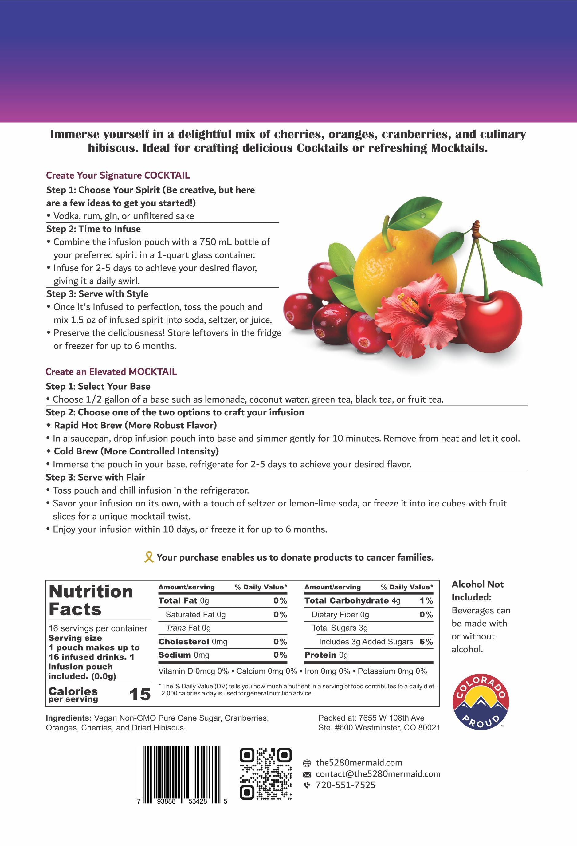 Ingredients: Cranberries, oranges, cherries, culinary hibiscus & non-GMO Turbinado sugar. No artificial ingredients!