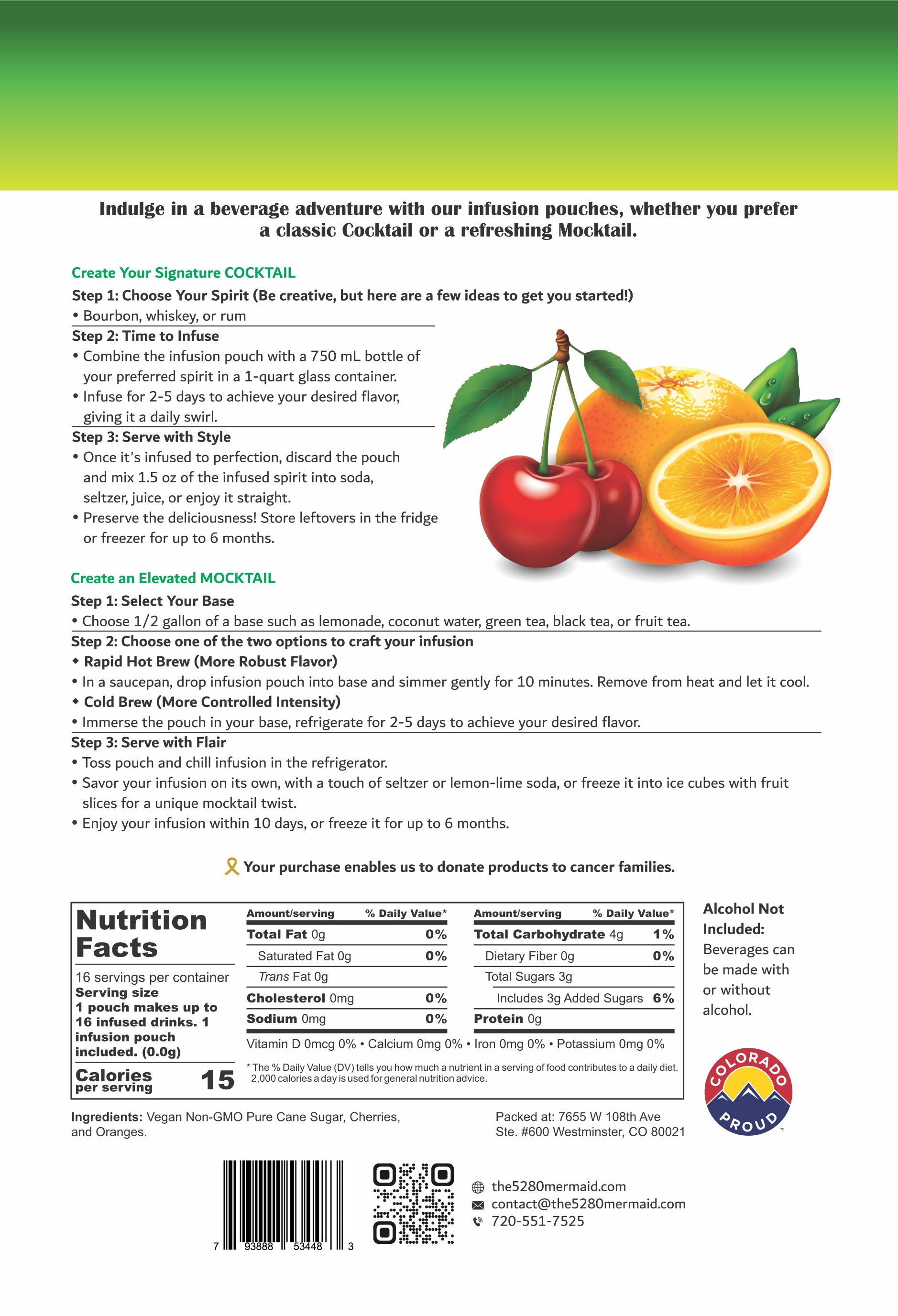 Ingredients: Sweet cherries, oranges, Angostura bitters, infused non GMO Turbinado sugar and light brown pure cane sugar cubes. No artificial ingredients ever!
