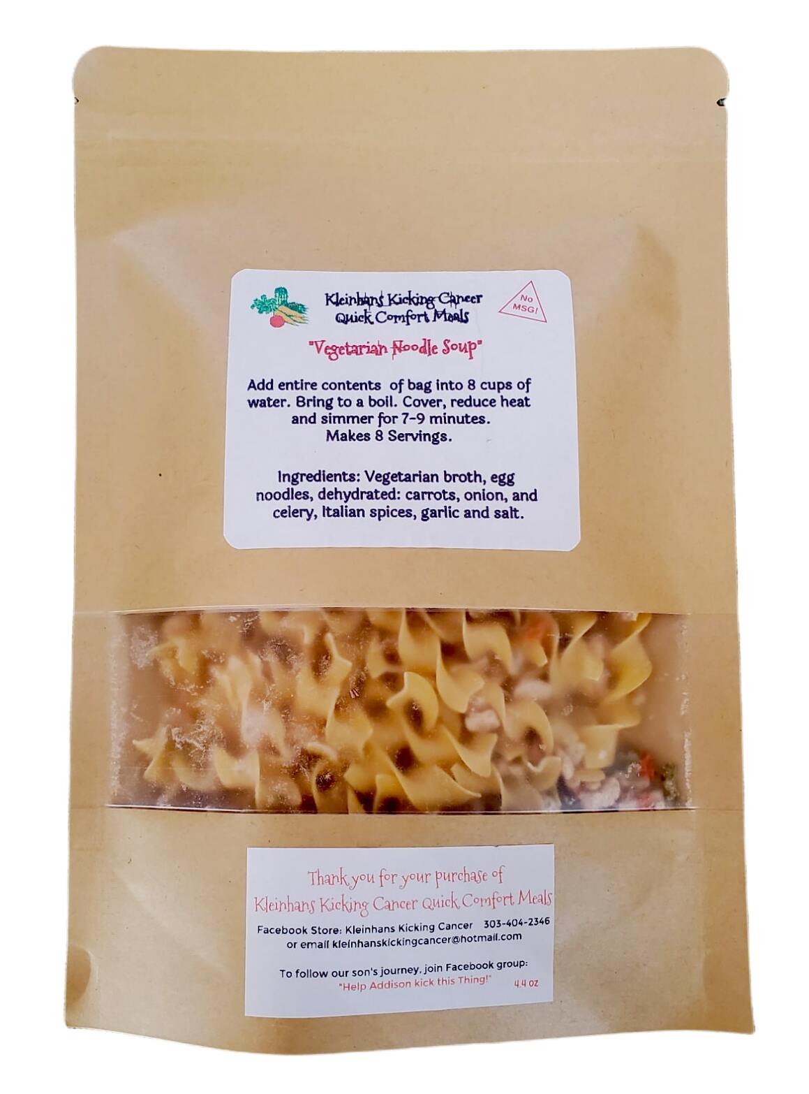 Ingredients: Vegetarian broth, egg noodles, dehydrated: carrots, onion and celery, Italian spices, garlic and a dash of salt. No MSG! Makes 8 servings. Cook time: 9 minutes.